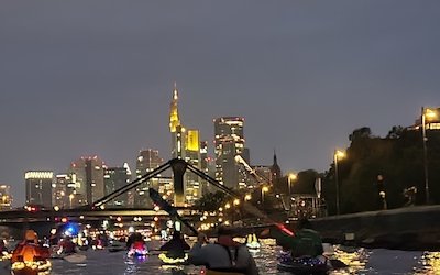 Die Mischung aus Generationen und Bootstypen verlieh der Veranstaltung eine lebendige, vielfältige Dynamik. Ab und zu ließen sich die Paddler:innen treiben, um die eindrucksvolle Skyline bei Nacht zu genießen und ausgiebig zu fotografieren. Diese spiegelte sich im Main; die Lichter der Hochhäuser und Brücken verdoppelten sich in den Wellen. Zusätzlich erzeugten die fantasievollen Beleuchtungen an den Booten zauberhafte Effekte auf dem Fluss. Kleine Lampen, farbige Laternen und reflektierende Dekore verwandelten die Boote in schwimmende Laterneninseln, so dass Passanten am Ufer und auf den Frankfurter Brücken beeindruckt stehen blieben und Beifall spendeten.