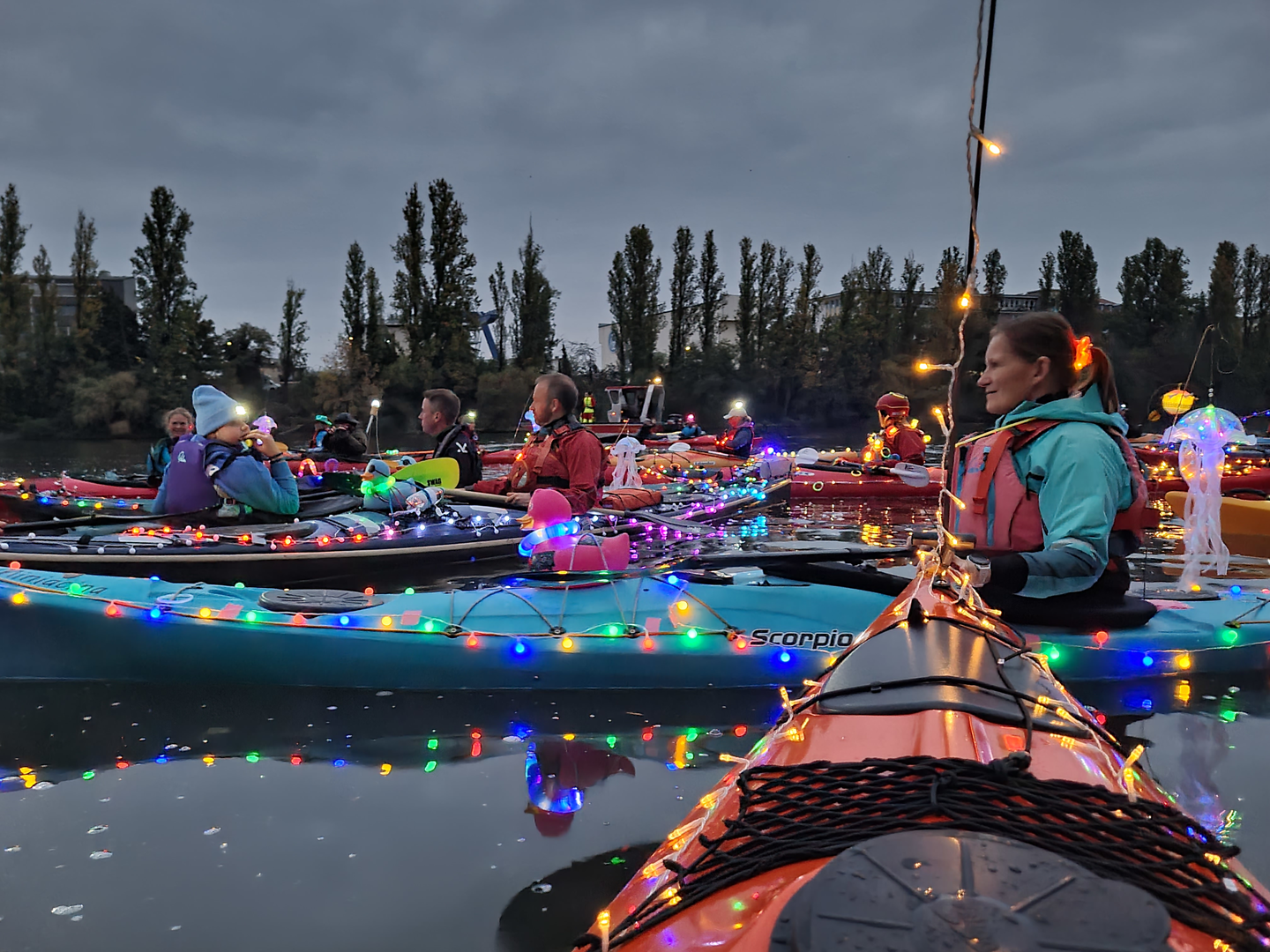 Auf der Kanufahrt flussauf zum Start erlebten die Teilnehmenden (im Alter von sieben bis 85 Jahre) die Frankfurter Skyline bei Tag, für viele ein imposanter Eindruck. Die Bootsflotte aus Touring- und Seekajaks, Faltboote, Canadiern und sogar Abfahrts- und Wildwasserbooten wurde am Rudererdorf mit den fantasievollen Funzeln geschmückt und setzte sich mit beginnender Dunkelheit flussab in Bewegung. Die Fahrt wurde zusätzlich begleitet von zwei Booten der DLRG, die routiniert und unaufdringlich für Sicherheit sorgten. Dieses professionelle Begleitbild gab allen Teilnehmenden Sicherheit und trug zur entspannten Stimmung bei.