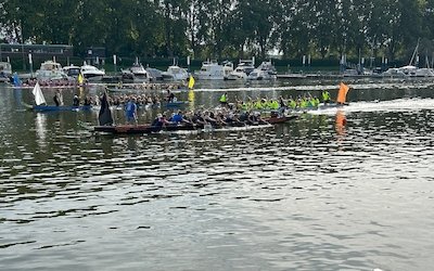 Zum Schluss wurde noch ein Staffellauf mit den 12 Teams durchgeführt. Je drei Teams bilden eine Gruppe und fuhren über eine Distanz von 100m. Die Teams der gebildeten Gruppen standen sich jeweils am Ende der 100m gegenüber und erst wenn das erste Team aus der jeweiligen Gruppe mit dem Drachenkopf den Drachenkopf des zweiten Teams und dann später das zweite Team den Drachenkopf vom dritten Team passierte, durften diese starten.